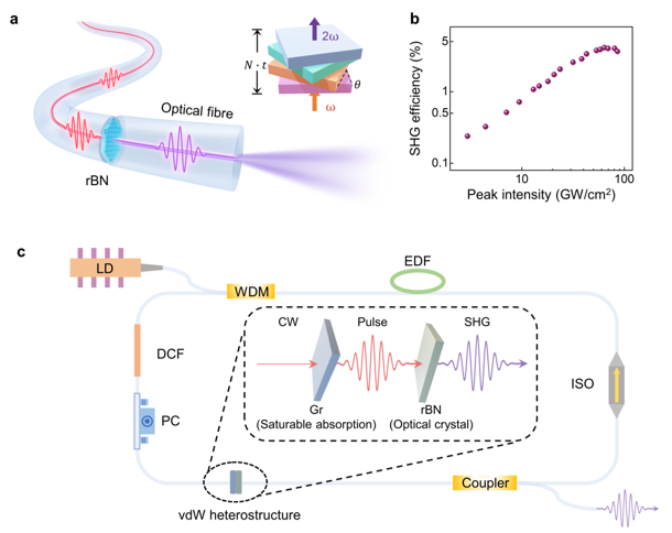 全光纤超快电子源的研发离不开全光纤超快变频激光器,但传统光纤材料二阶非线性光学响应极弱,给全光纤频率转换、电光调制等核心功能的实现带来难题。研究团队创新采用光纤端面范德华晶体集成技术,研制出全光纤锁模倍频激光器---通过在光纤端面精确堆垛多层菱方氮化硼(rBN)晶体,利用界面转角调控几何相位,建立了适用于线偏振光激发的多层转角相位匹配机制。这一方法既规避了传统晶体厚度导致的模式失配问题,又突破了传统相位匹配理论在光纤集成中的兼容性限制,在十微米尺度内实现了 4.1% 的高光学倍频转换效率。基于该集成架构的全光纤非线性器件,不仅能保持高非线性转换效率,还能输出高质量高斯基模,且长期稳定性优异。团队进一步利用光纤集成石墨烯/菱方氮化硼异质结复合器件,实现了全光纤激光器锁模脉冲与倍频信号的同步输出。